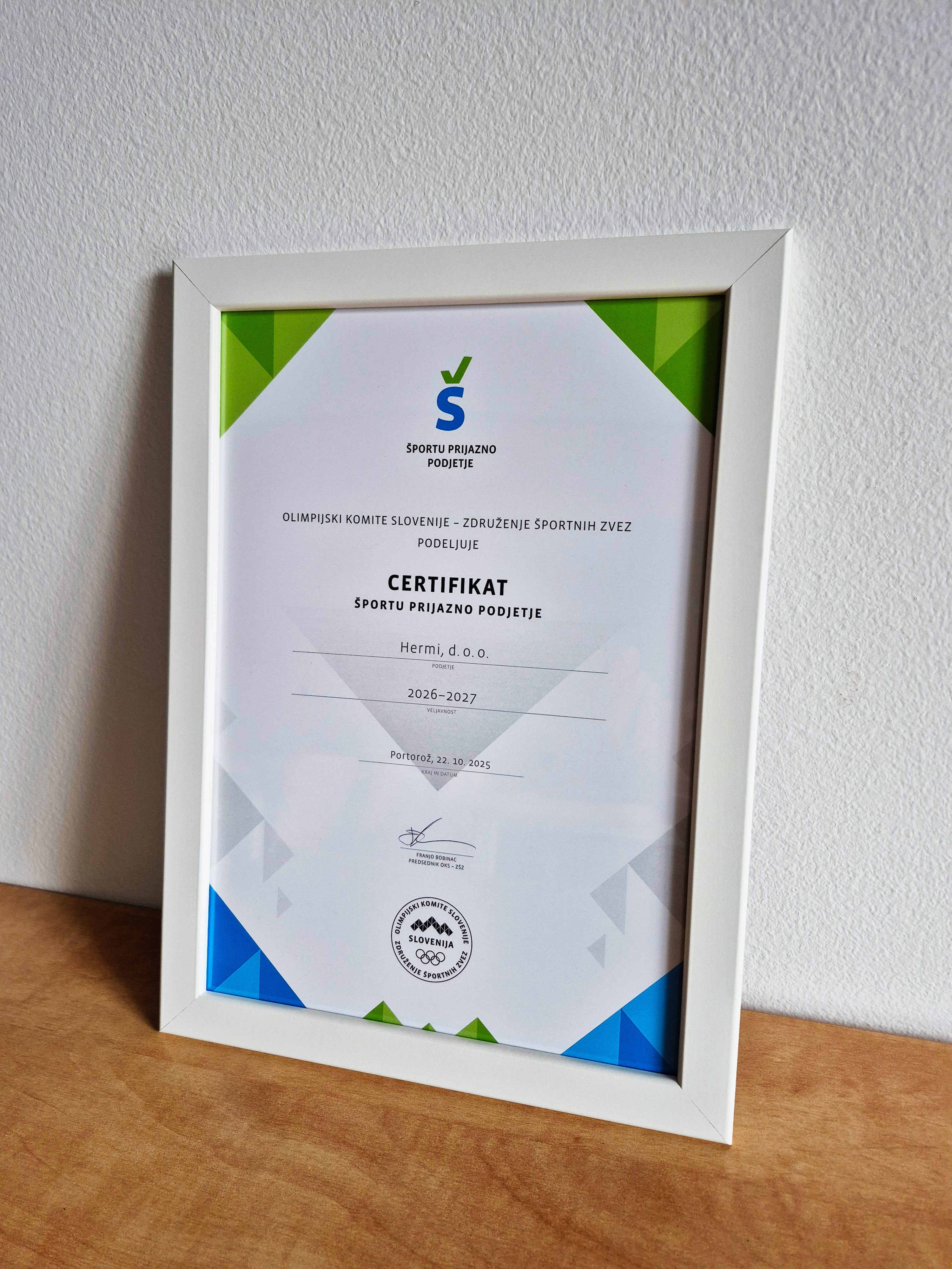 Das Olympische Komitee von Slowenien verlieh Hermi das Zertifikat für sportfreundliches Unternehmen, das das Engagement des Unternehmens für die Förderung von Sport, Bewegung und gesunden Gewohnheiten sowohl bei den Mitarbeitern als auch in der breiten Öffentlichkeit bestätigt.